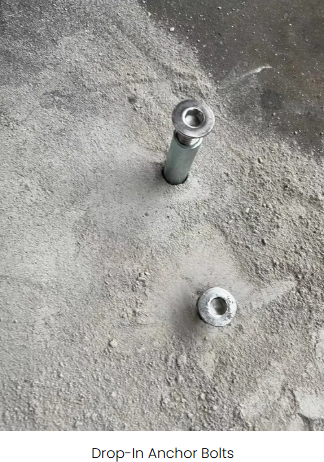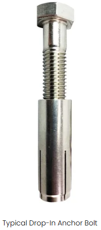 Use standard drop in masonry anchors. Insert the drop in anchor into the drilled holes with the open side facing up. Use a setting tool to lock the drop-in anchor into place. Place the setting tool into the anchor and strike the top of the setting tool with a hammer, until the lip of the tool touches the rim of the anchor. This will lock the threaded receiver sleeve in place permanently.
