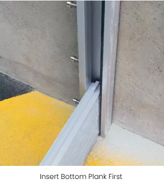 When a flood is expected, insert planks into the U channels on either side of the door opening.